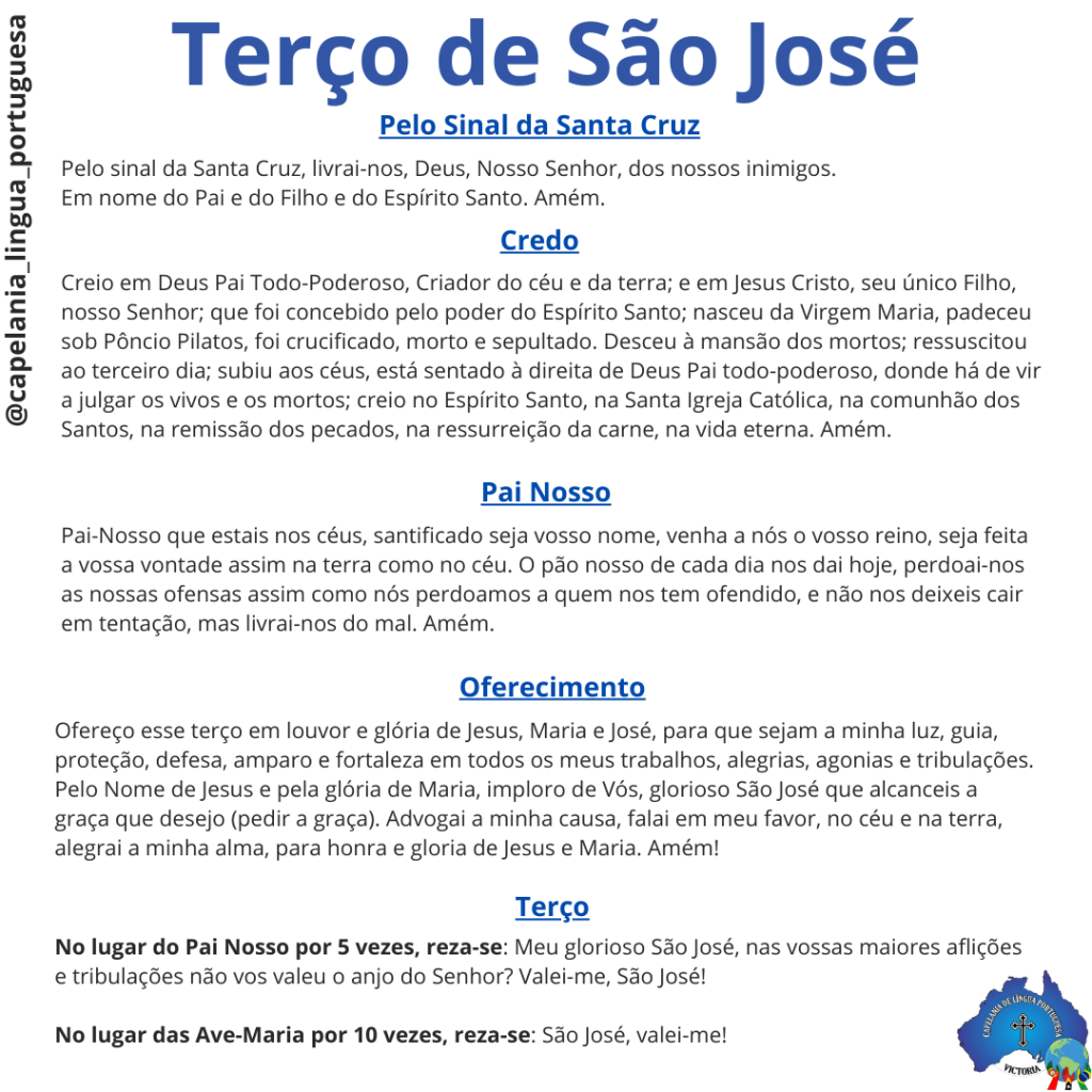 Reze conosco o Terço de São José pela página do facebook da Capelania de Lingua Portuguesa todas as Terças-feiras as 8:00pm. Aprenda a rezar esse significativo terço abaixo ao Patrono da Igreja Católica.